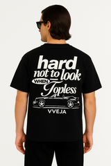 The front features a minimal VVEJA puff print on the chest, while the back steals the show with the powerful “Hard not to look when topless” graphic paired with a sleek convertible car artwork.